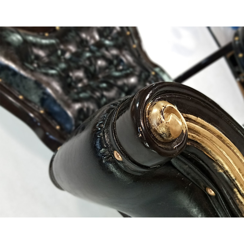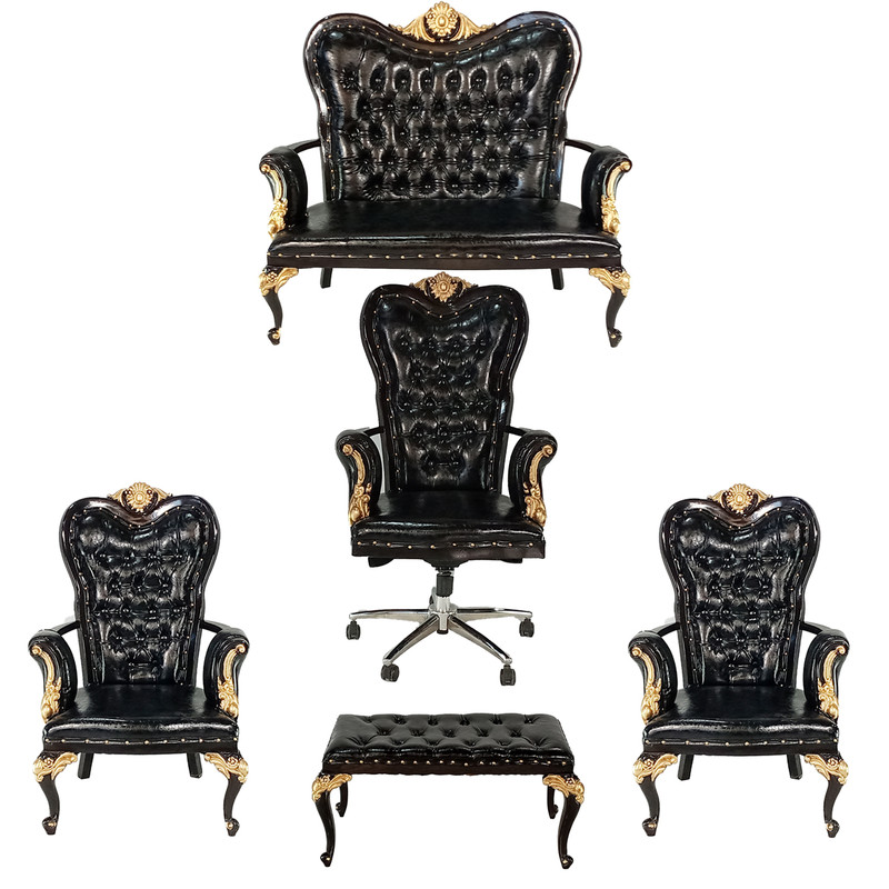 نکته: رنگ فریم چوبی این محصول در رنگبندیهای مختلف چرم یکسان بوده رنگ چوب قهوه ای سوخته با سرگل های ورق طلا است این محصول دارای یک عدد مبل دونفره به ابعاد 130x80x115 و دو عدد مبل یکنفره به ابعاد 80x80x115 و یک عدد جلو مبل به ابعاد 95x55x40 و یک عدد صندلی مدیریت به ابعاد 75x80x130 می باشد