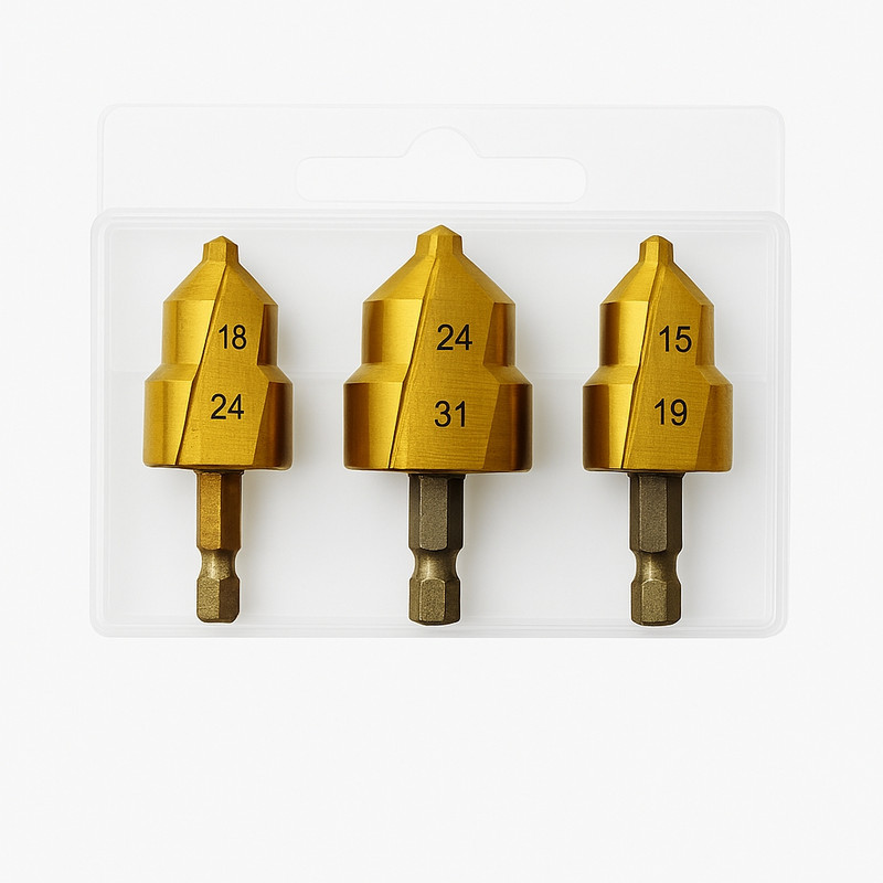مته کاجی پلهای HSS تیتانیومی سایز ۴ تا ۳۲ میلیمتر، ابزاری چندکاره برای سوراخکاری دقیق و تمیز لوله سفید، PVC، پلاستیک و ورقهای فلزی نازک؛ مناسب استفاده خانگی و صنعتی.