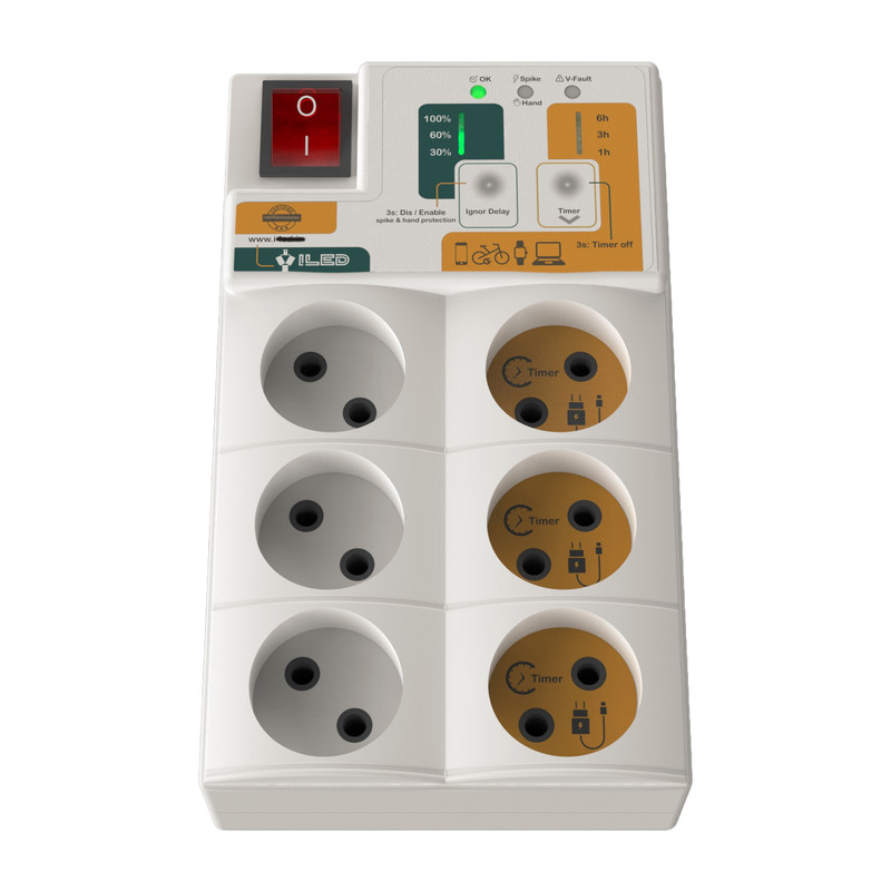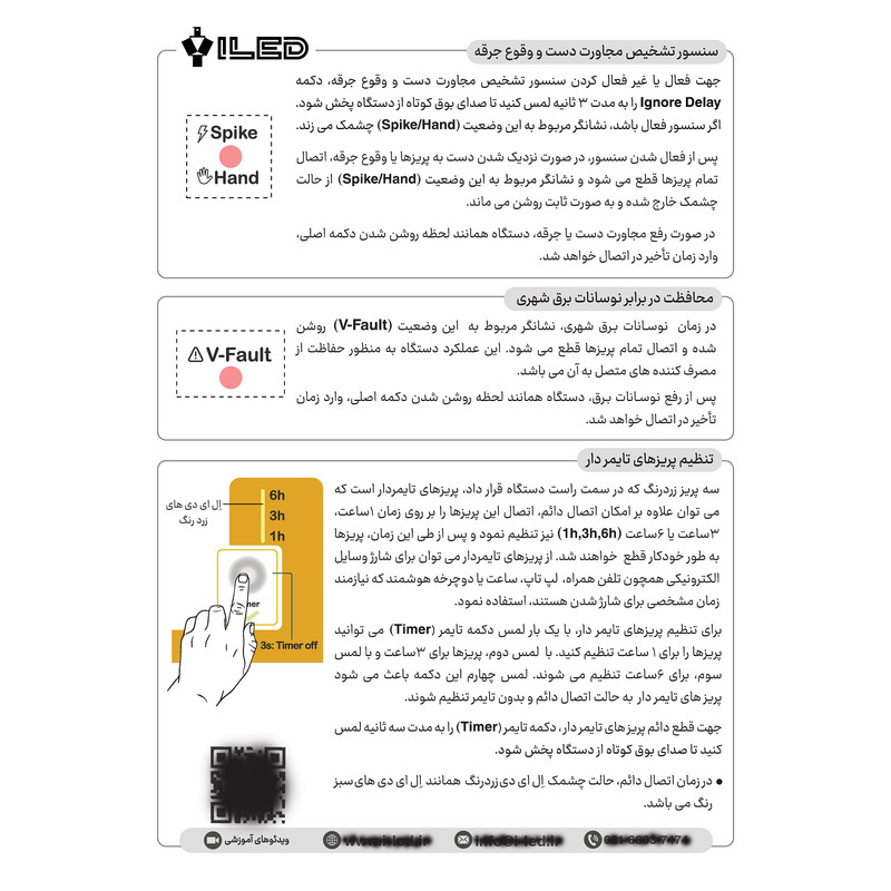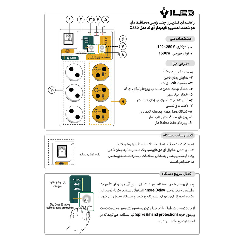 محافظ برق + 3 عدد خروجی تایمر دار (با قابلیت تنظیم 1و 3 و 6 ساعت و دائم وصل) + سنسور تشخیص مجاورت دست + سنسور تشخیص جرقه + امکان رد کردن زمان تاخیر اولیه در محافظ برق + کلید های لمسی + دارای بازخورد صوتی