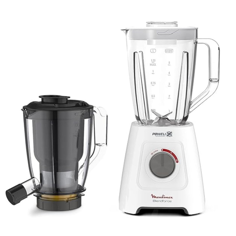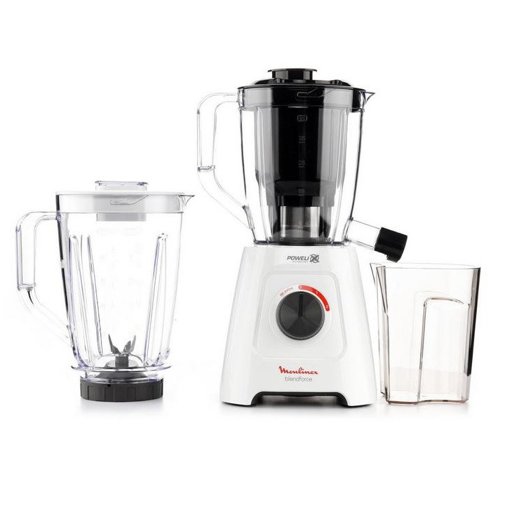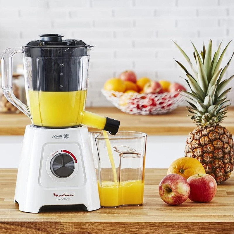 مخلوط کن دو منظوره مولینکس که علاوه بر مخلوط کن قابلیت آبگیری میوه هایی مانند سیب، هویج، سبزبجات، کیوی، هلو، توت فرنگی و ... را داراست، موتور با توان 600 وات، پارچ از جنس پلی کربنات سبک و مقاوم، گنجایش 2 لیتر، تیغه های پارچ مخلوط کن از جنس فولاد ضد زنگ با شش پره که براحتی میتوانید یخ، انواع ککتل ها و اسموتی ها را تهیه کنید، دارای دو سرعت قابل تنظیم بهمراه حالت پالس، طراحی و مهندسی در کشور فرانسه مونتاژ نهایی در کشور چین، تیغه های مخلوط کن از سری POWELI technology میباشد که تا 30 درصد سریع تر مواد را میکس میکند،