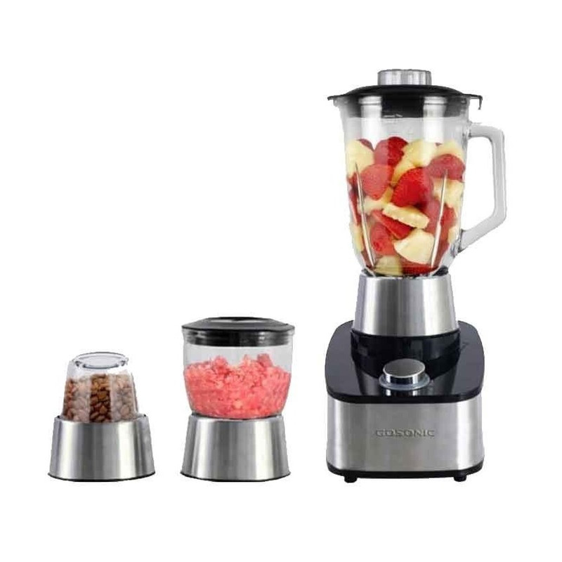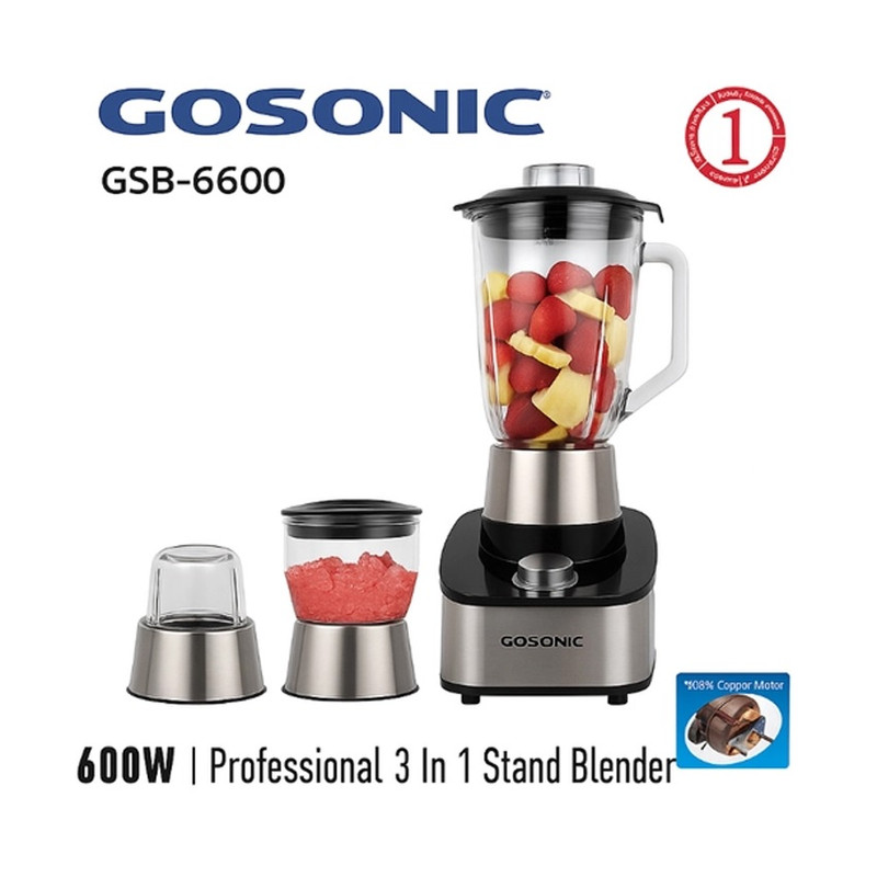 مخلوط کن سه کاره گوسونیک، موتور با سیم پیچ صد در صد مسی با توان ۶۰۰ وات، پارچ مخلوط کن شیشه ای با گنجایش ۱.۵ لیتر، دارای ظرف خردکن و آسیاب از جنس شیشه، ظرف مخلوط کن دارای شش تیغه از جنس استیل ضد زنگ، چهار سرعت قابل تنظیم بهمراه حالت پالس(لحظه ای)، تیغه پارچ مخلوط دارای شش پره استیل، دارای سیستم ایمنی توقف موتور در حالت داغ شدن بیش از حد، پایه های ظرف خردکن و آسیاب با روکش استیل