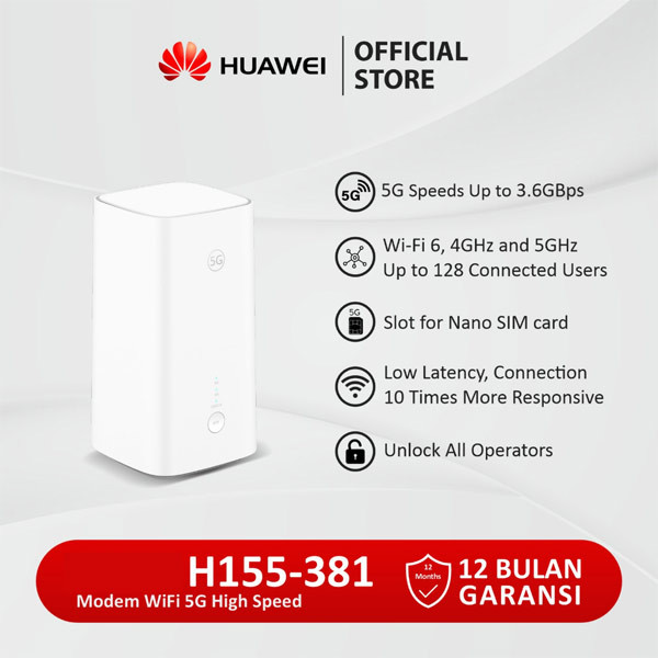 مودم Huawei 5G H155-381 CPE5یک مودم رومیزی سیمکارت خور فول باند میباشد که با پشتیبانی از تمامی سیمکارتهای عادی و به خصوص سیمکارتهای دیتا یا TD-LTE سرعتی فوق العاده و با هزینه های بسیار پایین برای کاربران حرفه ای فراهم میسازد . همچنین چیپست استفاده شده در این مودم balong 5000 میباشد که به علت پشتیبانی فوق لعاده این چیپست از شبکه 5G این مودم گزینه ای بسیار مناسب برای افراد آینده نگر میباشد.این مودم دارای قابلیتهای بسیاز زیادی از جمله قفل دکل ، نصب vpn و پشتیبانی از وای فای 2.4GHz و 5GHz و WiFi6 و … میباشد که تمامی این تنظیمات از طریق برنامه huawei all life قابل اجراست.