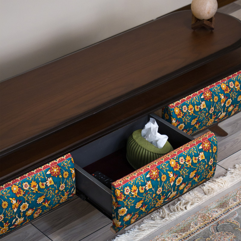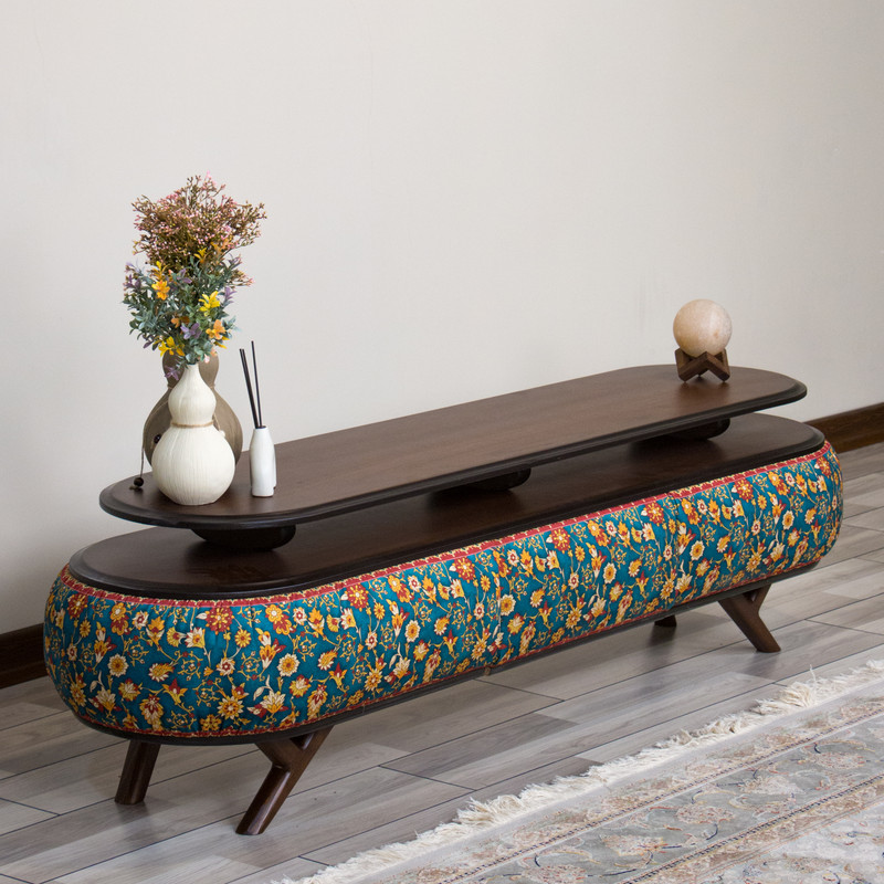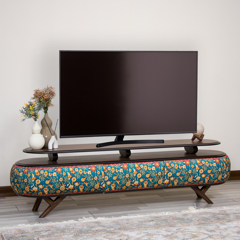 ویژگیها: طراحی مدرن با الهام از هنر ایرانی، پایههای چوبی اریب، فضای نگهداری وسایل الکترونیکی، هماهنگ با میز جلو مبلی و عسلی همطرح