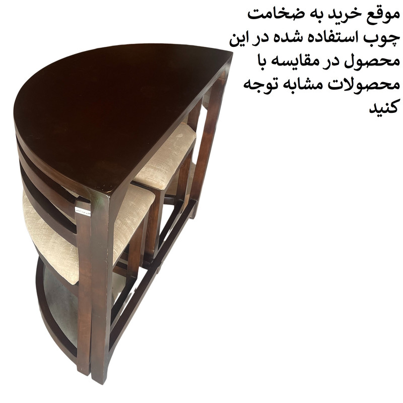 میز به صورت نیم دایره است.| ضخامت چوب در پایه های میز حدودا 5x3 سانتیمتر.| دارای اتصالات بسیار محکم