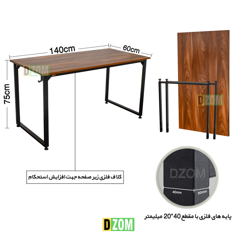 محصول بصورت سلف اسمبل (مونتاژی) تولید شده است. جنس صفحه MDF درجه یک طرح چوب با رویه ضد آب می باشد. زیر صفحه MDF کلاف فلزی کار شده است. پوشش رنگ فلز: رنگ کوره ای الکتروستاتیک (یکنواخت، ضد خش و بسیار با کیفیت). حمل و نقل آسان. حمل ارزان و مقرون به صرفه به تمام نقاط کشور. طراحی مدرن