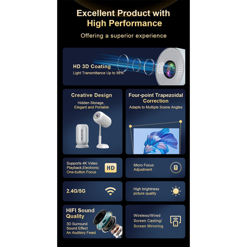 دارای ریموت کنترل ، مجهز به تصحیح کننده زاویه تصویر خودکار ، تنظیم زوم برقی با کنترل ،بلوتوث نسخه ۵ ، وای فای نسخه ۶ ، سیستم عامل اندروید ، 8 گیگ حافظه داخلی ، ۱ گیگ رم ، پروسسور Quad-core ARM Cortex-A۵۳ ، کارت گرافیک Mali-G۳۱ supports OpenGL ES۳.۲,Vulkan ۱.۱,and OpenCL۲.۰ ، پخش کلیه فرمتهای فیلم ، عکس و صدا ، قابلیت نصب برنامه های اندروید
