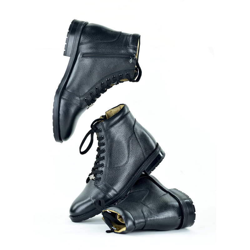 رویه و آستر این کفش چرم طبیعی بوده و کفی هفت لایه دست ساز این مدل نیز با چرم طبیعی گاوی بصورت انحصاری تولید شده و دارای لایه سازگار با خارپاشنه و بالشتک گردش هوا میباشد، که با کاهش فشار وارده و ایجاد حالت ارتجاعی هنگام راه رفتن از آسیب به زانو ها و ستون فقرات جلوگیری میکند.