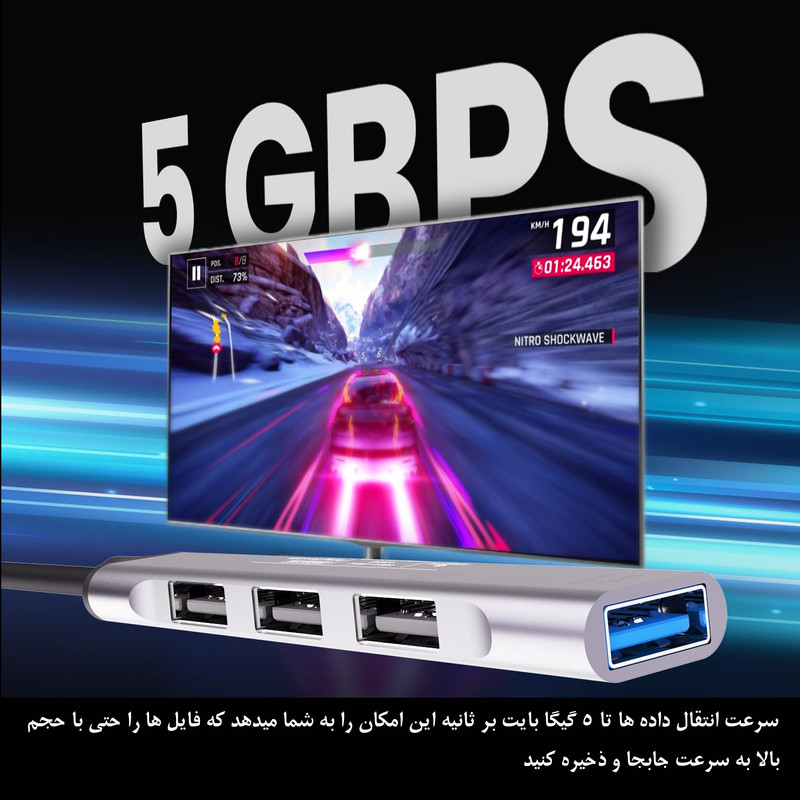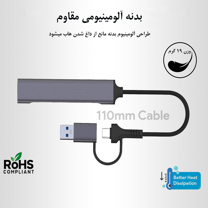 چهار پورت (۱ پورت USB ۳.۰ و ۳ پورت USB ۲.۰) - سرعت بالا در انتقال دادهها (USB ۳.۰: تا ۵ گیگابایت در ثانیه، USB ۲.۰: تا ۴۸۰ مگابایت در ثانیه) - قابلیت شارژ دستگاههای قابل شارژ - سیستم حفاظت چندگانه - سازگاری با سیستم عاملهای مختلف (ویندوز، مک، لینوکس) - سازگاری با دستگاههای OTG - طراحی باریک و زیبا با جنس آلومینیوم - سبک و قابل حمل