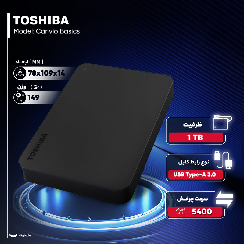 هارد اکسترنال توشیبا مدل Canvio Basics ظرفیت یک ترابایت دارای رابط USB Type-A 3.0
