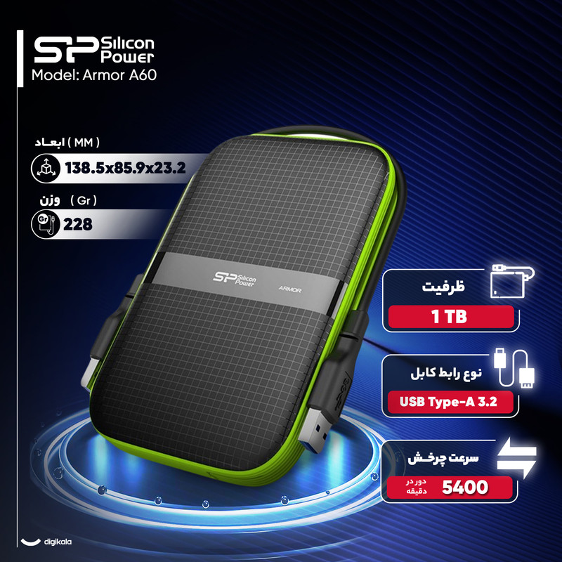 هارد اکسترنال سیلیکون پاور مدل Armor A60 ظرفیت یک ترابایت دارای رابط USB Type-A 3.2