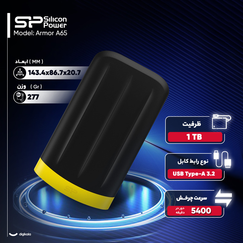 هارد اکسترنال سیلیکون پاور مدل Armor A65 ظرفیت یک ترابایت دارای رابط USB Type-A 3.2