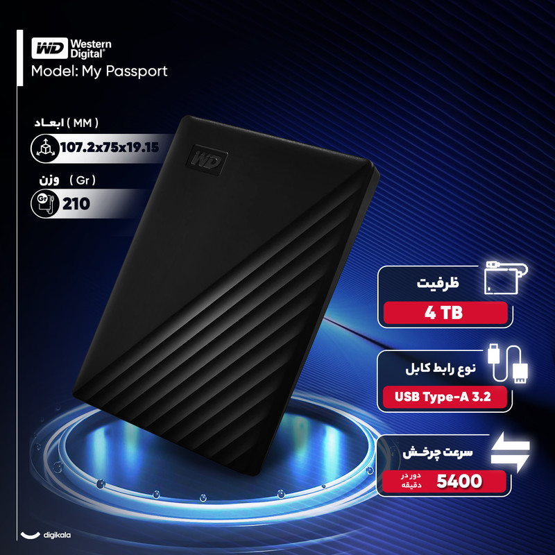 هارد اکسترنال وسترن دیجیتال مدل My Passport ظرفیت چهار ترابایت دارای رابط USB Type-A 3.2