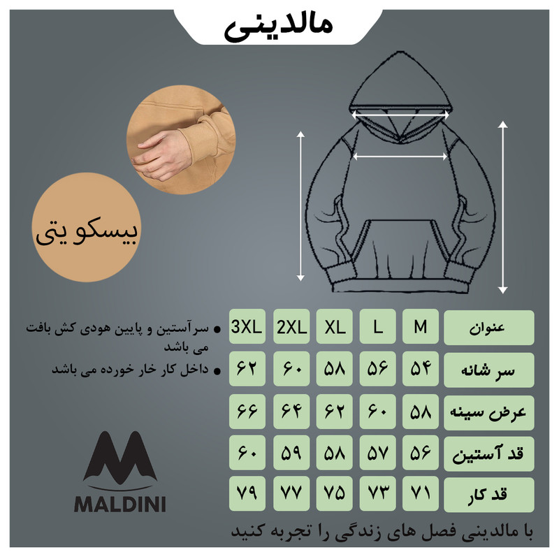 سرآستین کار کش بافت می باشد که باعث افزایش عمر محصول می باشد . کلاه هودی دوبل و از جنس خود کار می باشد.داخل کار خار خورده می باشد