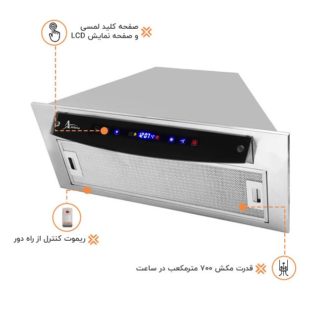 - مکش: 700 متر مکعب - میزان صدا: 54 تا 56 دسیبل - صفحه نمایشگر: ندارد - صفحه کنترل: لمسی - کنترل از راه دور: دارد - سنسور: دارد - روشنایی: لامپ LED-SMD