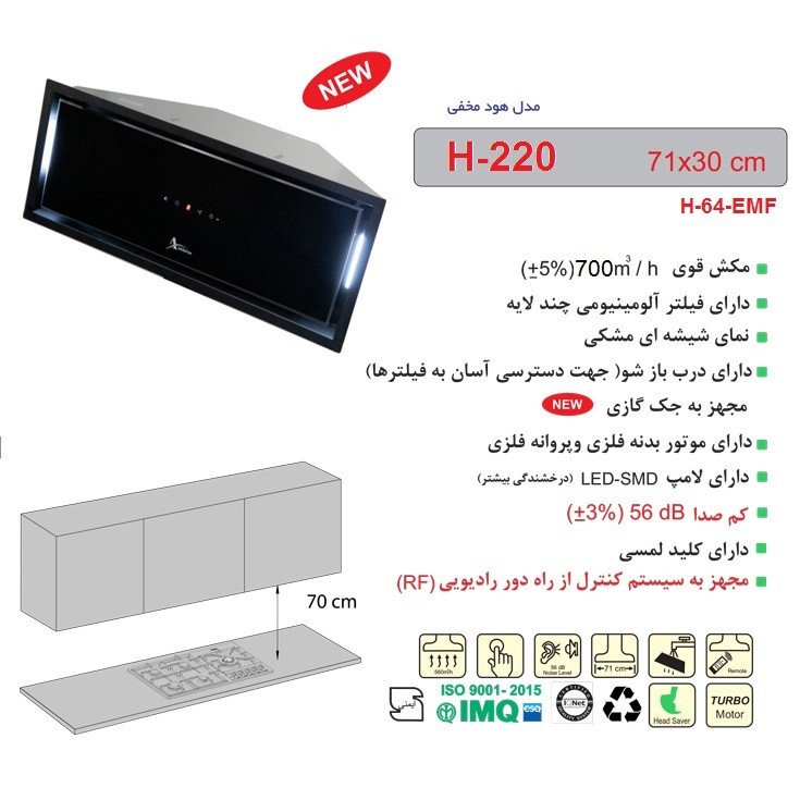 دارای موتور توربو فلزی حلزونی با پروانه فلزی - دارای درب بازشو شیشه ای با جک گازی - مجهز به سیستم کنترل از راه دور رادیویی - صفحه نمایش SEVEN SEGMENT - لامپ LED-SMD (درخشندگی بیشتر)