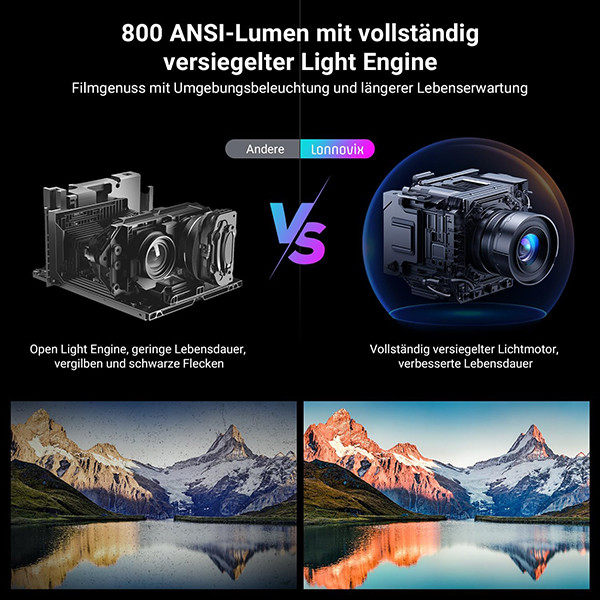 4. روشنایی قدرتمند ۸۰۰ ANSI لومن با موتور نوری کاملاً مهر و موم شده، قابل مشاهده حتی در نور محیط