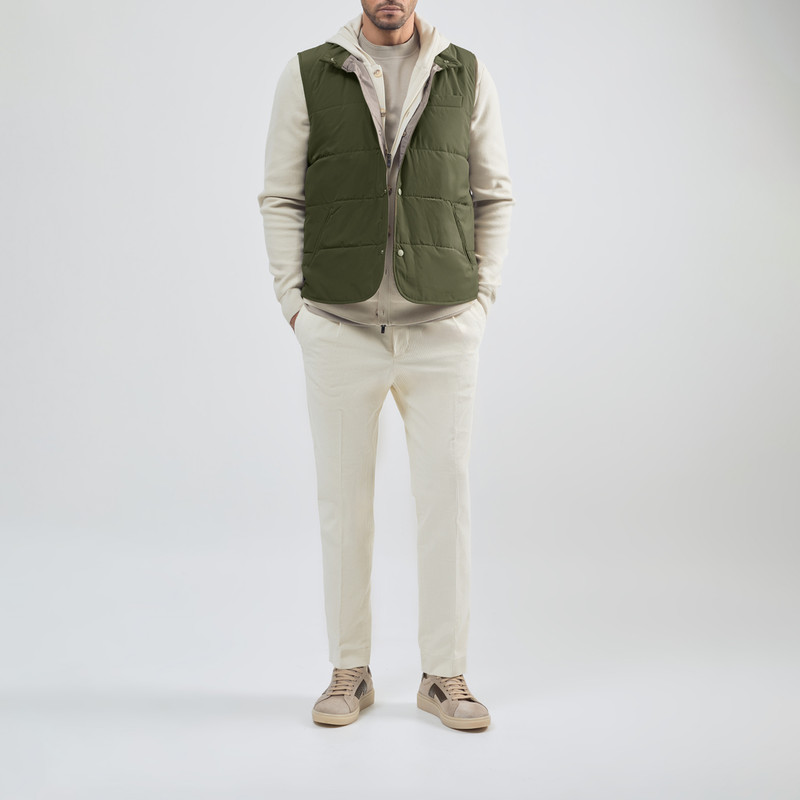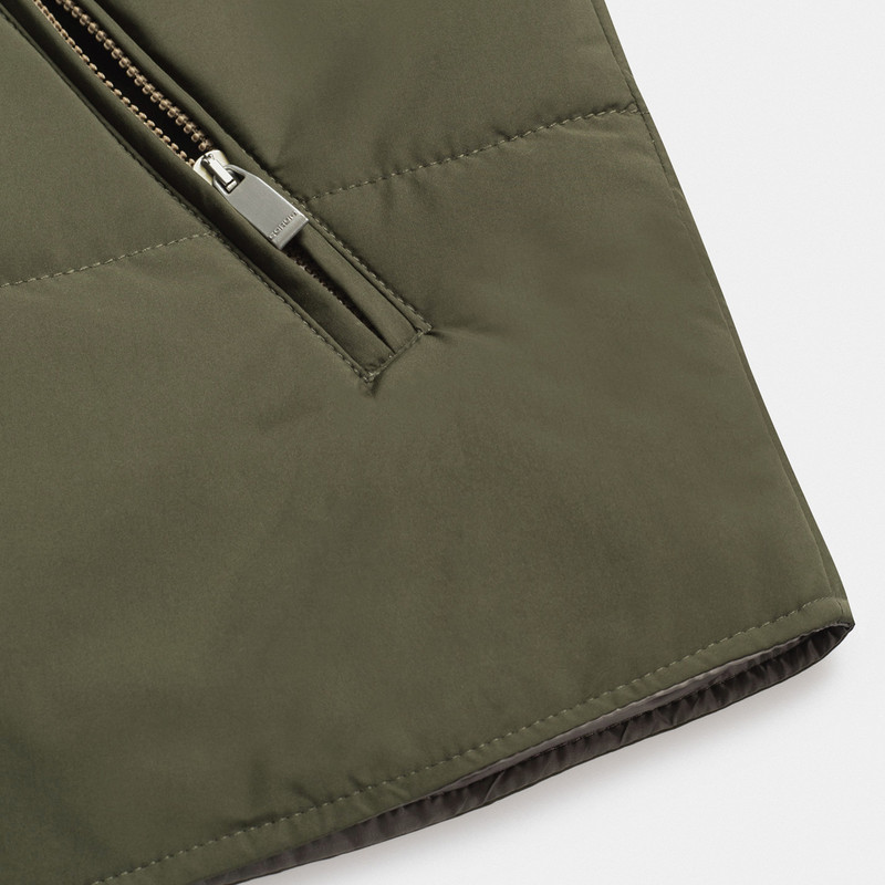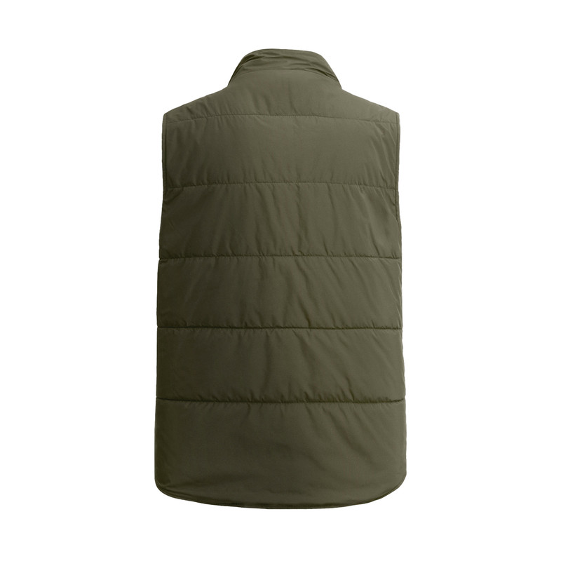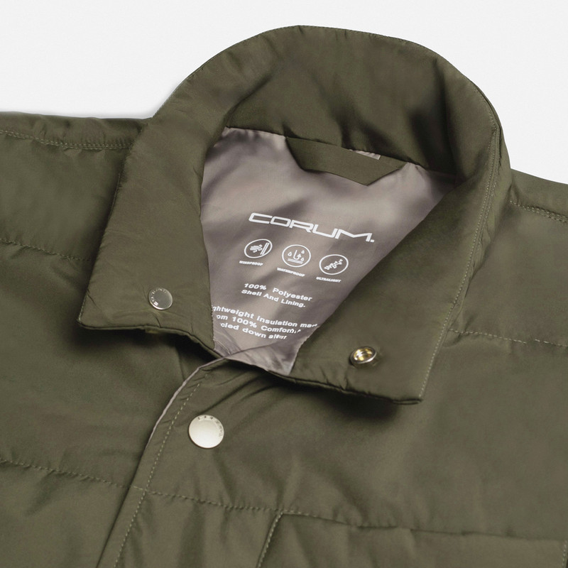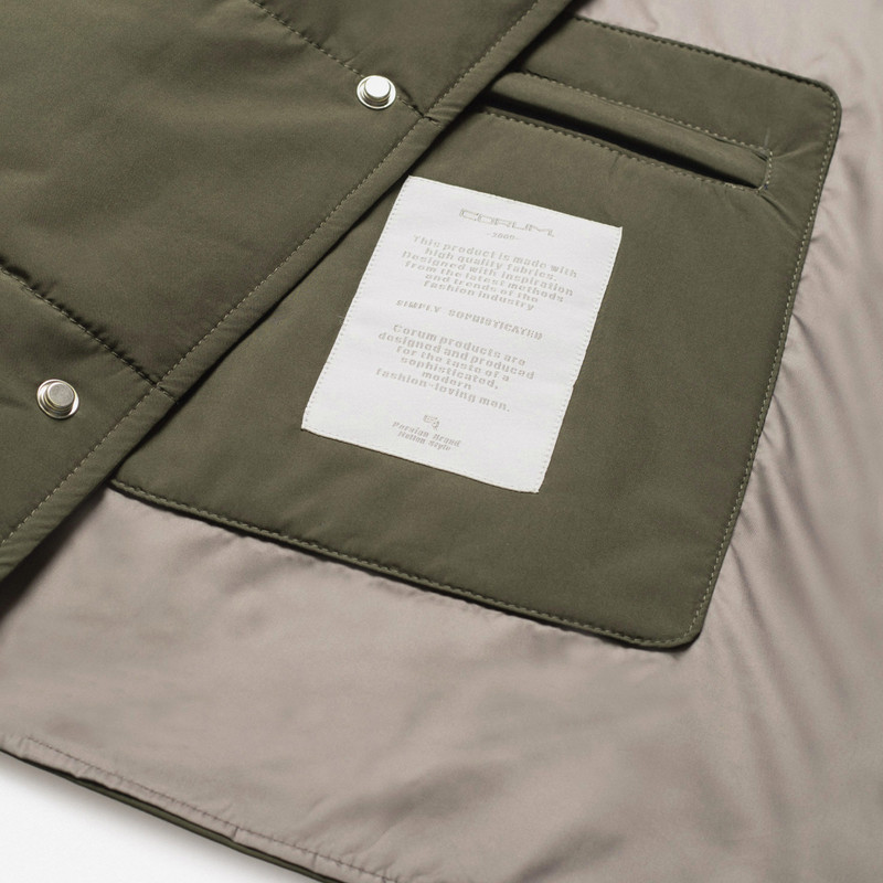 ژیله کاپشنی دکمه پرچی، الیاف بسیار سبک، پارچه ضد نفوذ آب و باد، دارای یک لایه پشم شیشه داخلی، آستر داخلی ضد آب، دارای سه جیب بیرونی و یک جیب داخلی