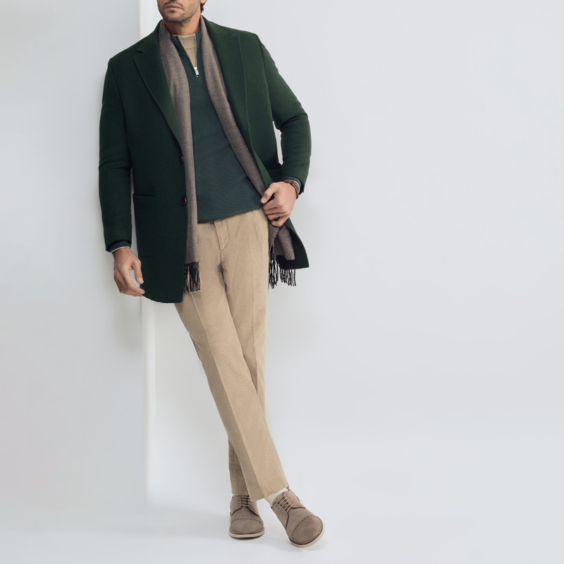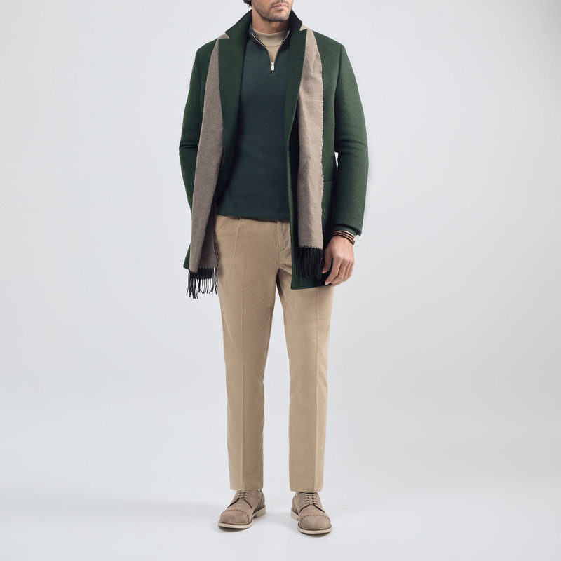 پالتو دو دکمه، یک چاک در پشت، دارای دوخت بانتو، دو جیب روکار، داخل نیم آستر
