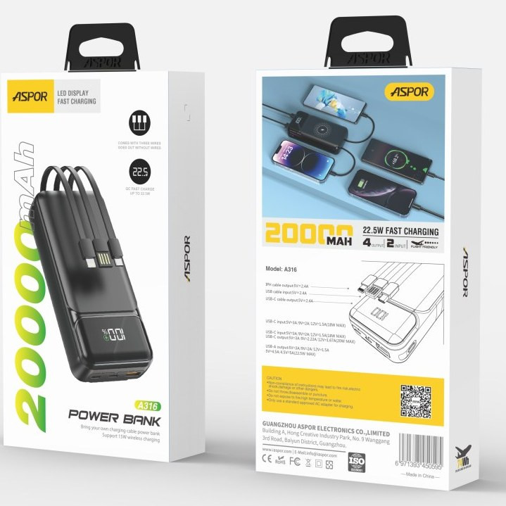 پاوربانک آسپور مدل A316 ظرفیت 20000 میلی آمپر ساعت
