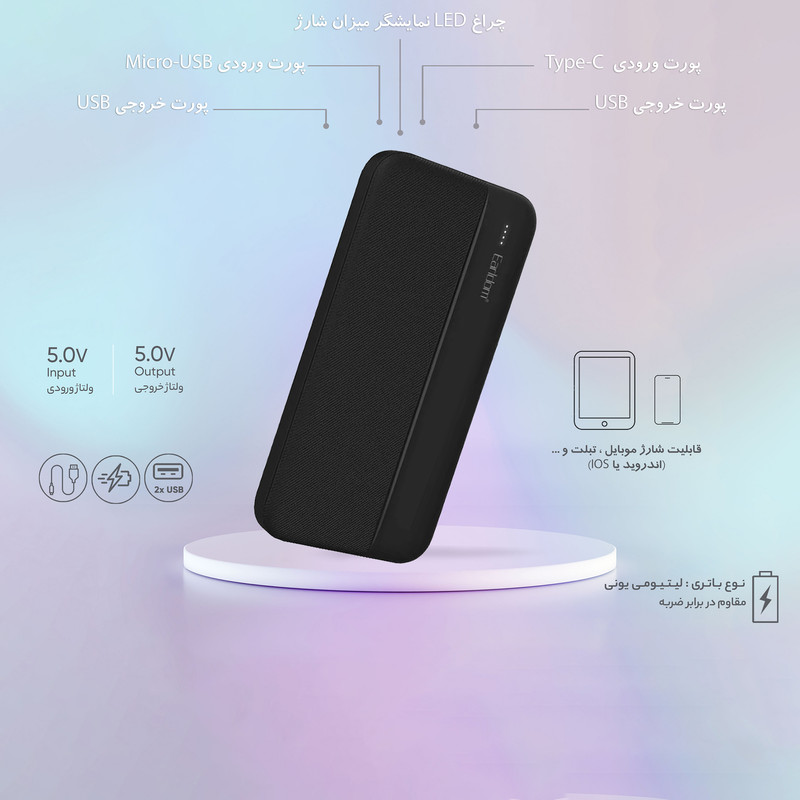 دارای چراغ نمایشگر میزان شارژ پاوربانک / دارای 2 پورت خروجی USB / دارای 2 پورت ورودی شارژ / ظرفیت باتری داخلی 10 هزار میلی آمپر