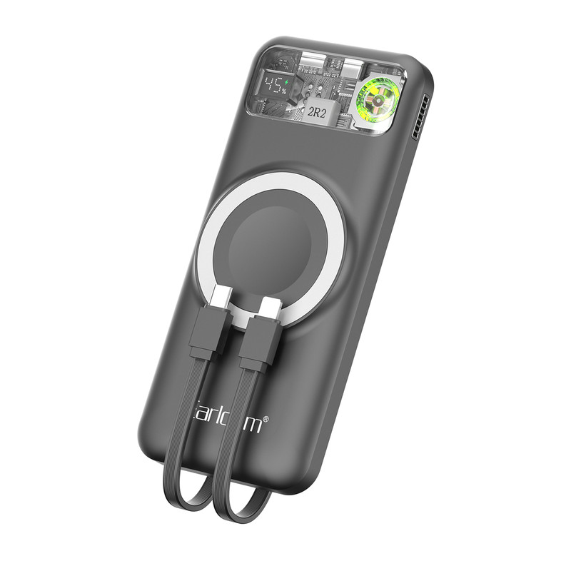 این پاوربانک دارای کابل تایپسی سرخود است که هم به عنوان ورودی با مشخصات 5V/3.0A، 9V/2A و 12V/1.5A و هم به عنوان خروجی عمل میکند. همچنین یک پورت تایپسی مادگی دارد که ورودی آن 5V/3.0A، 9V/2.22A و 12V/1.67A و خروجی آن نیز با همین مشخصات عمل میکند. پاوربانک دارای پورت لایتنینگ اپل است که ورودی آن 5V/2A و خروجی از طریق کابل اپل 5V/2A است. علاوه بر این، قابلیت شارژ بیسیم با توان 15 وات را دارد که امکان شارژ ساعت هوشمند با توان 2.5 وات را نیز فراهم میکند.