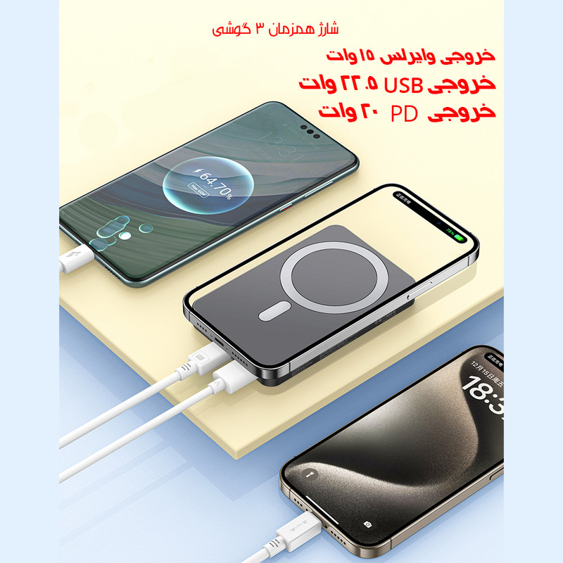 ورودی و خروجی تایپ سی با توان 20 وات- خروجی یو اس بی با توان 22.5 وات. خروجی بی سیم (وایرلس) با توان 5W.7.5W.10W.15W -