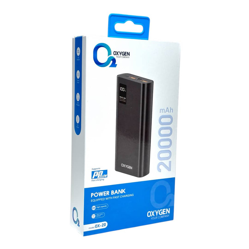 سازگار با پاوربانک Oxygen مدل OX‑20 (Fast Charge PD 22.5W، ظرفیت ۲۰۰۰۰ میلیآمپرساعت)، یک پاوربانک پرظرفیت با قابلیت شارژ سریع USB Power Delivery است که تقریباً با هر دستگاه USB سازگار است