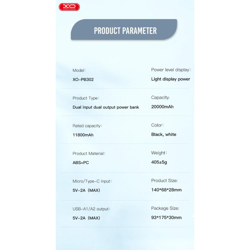 پاوربانک ایکس او مدل PB302 ظرفیت 20000 میلی آمپر ساعت
