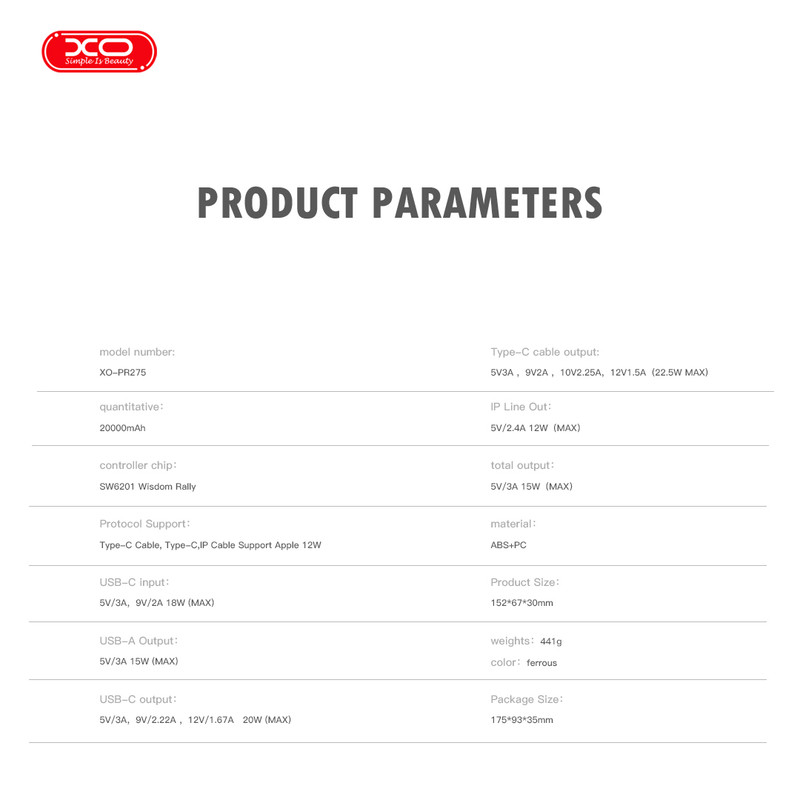 پاوربانک ایکس او مدل PR275 ظرفیت 20000 میلی آمپر ساعت