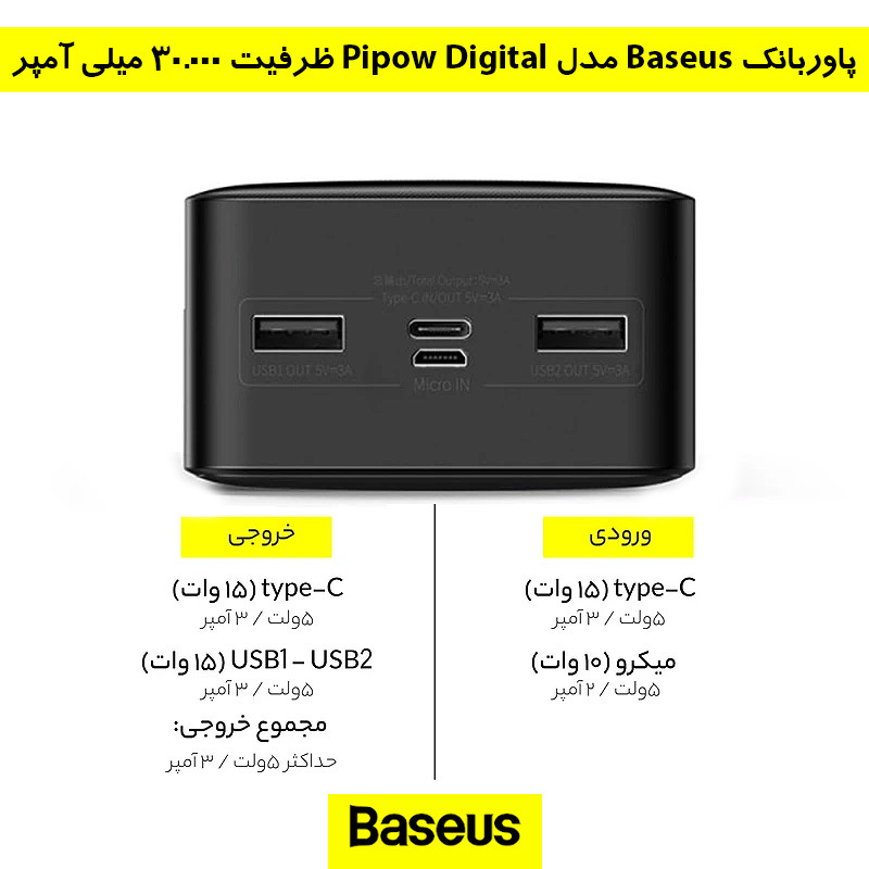 دارای صفحه نمایشگر عددی / دارای 2 پورت خروجی USB / دارای یک پورت ورودی Micro-usb / دارای یک پورت ورودی و خروجی از نوع Type-C