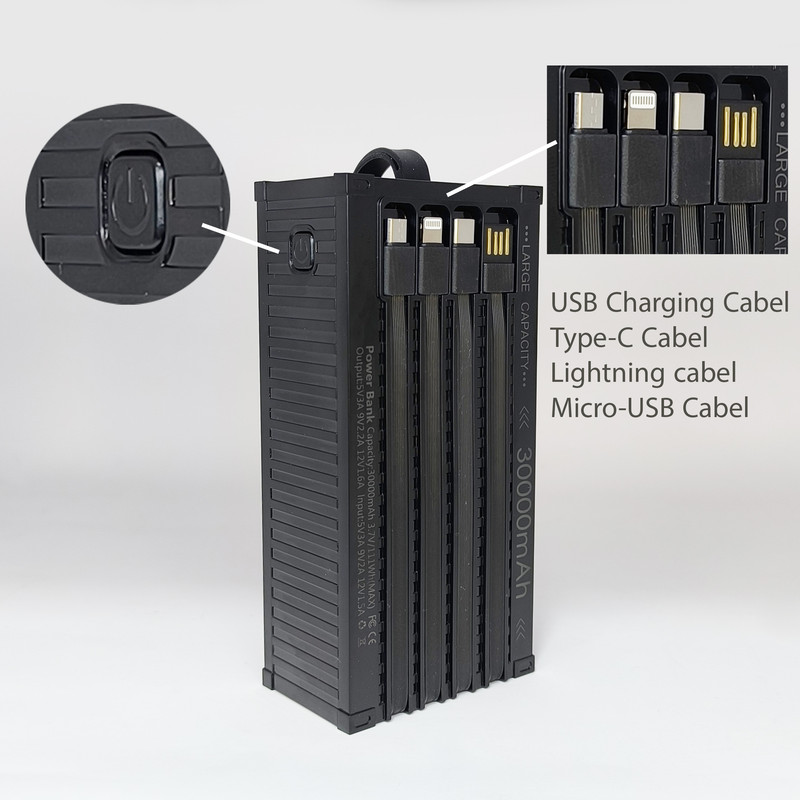 ظرفیت ۳۰ هزار میلی آمپر ساعت / دارای ۴ پورت USB-A / دارای یک پورت ورودی Micro-USB / دارای یک پورت Type-C برای ورودی و خروجی / دارای صفحه نمایشگر میزان شارژ به عدد / بدنه مسیار مقاوم / دارای ۴ کابل متصل به پشت پاوربانک برای شارژ خود پاوربانک و استفاده از آن / به همراه شارژر 45 وات / به همراه یک عدد کابل دو سر Type-C