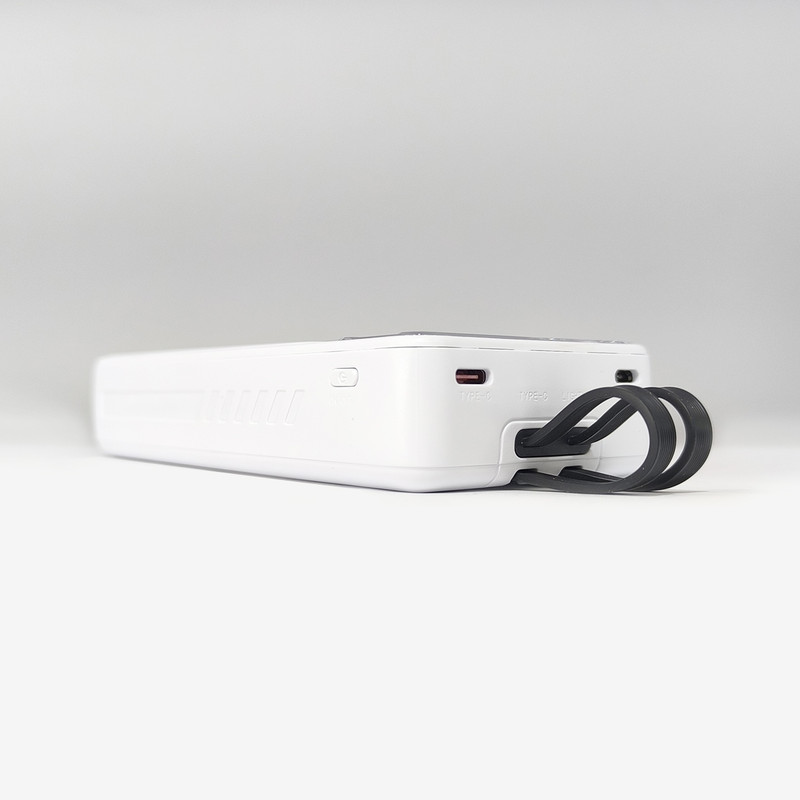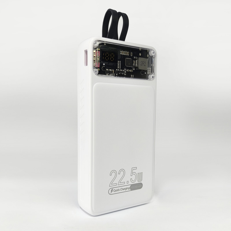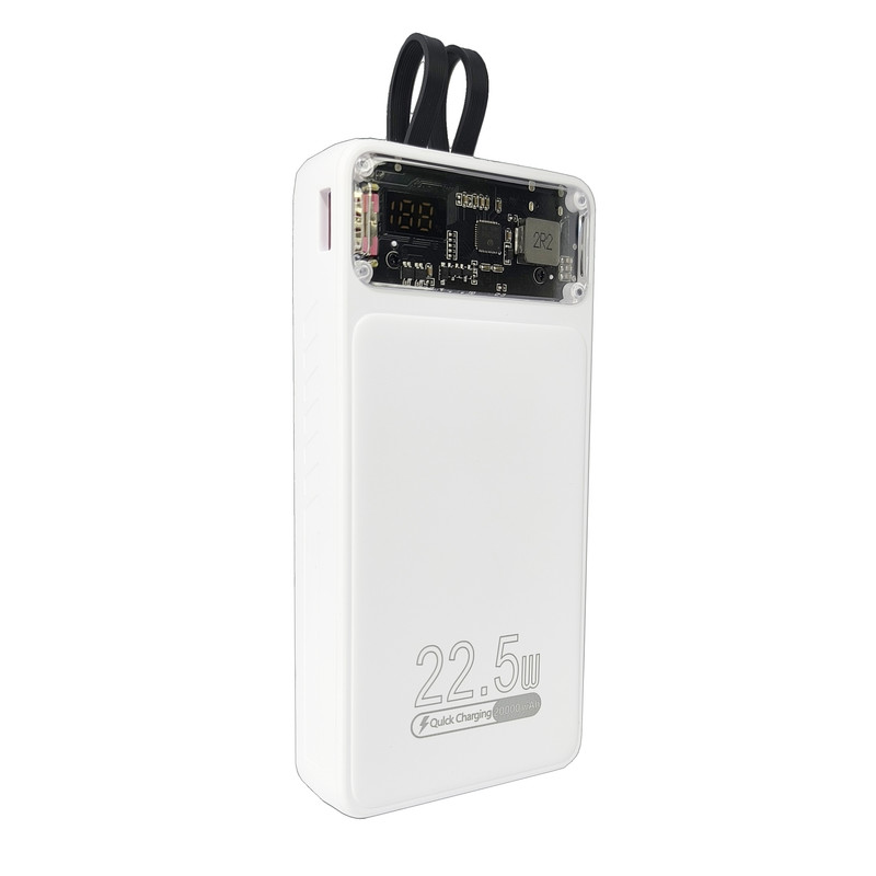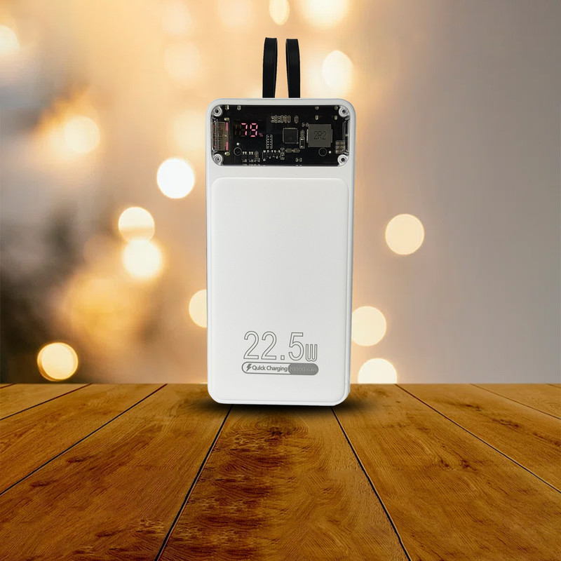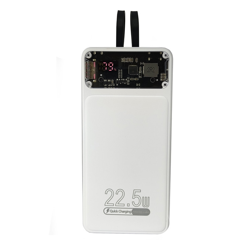 ظرفیت باتری داخلی 20 هزار میلی آمپر ساعت / دارای 2 عدد کابل متصل به خود از نوع Lightning و Type-C / دارای 3 پورت USB و Type-C و Micro-USB روی پاوربانک / دارای بخش شیشه ای / دارای صفحه نمایش عددی کوچک برای نمایش میزان شارژ باتری / حداکثر توان خروجی پاوربانک 22.5 وات / پورت USB-C ورودی و هم بعنوان خروجی استفاده می شود
