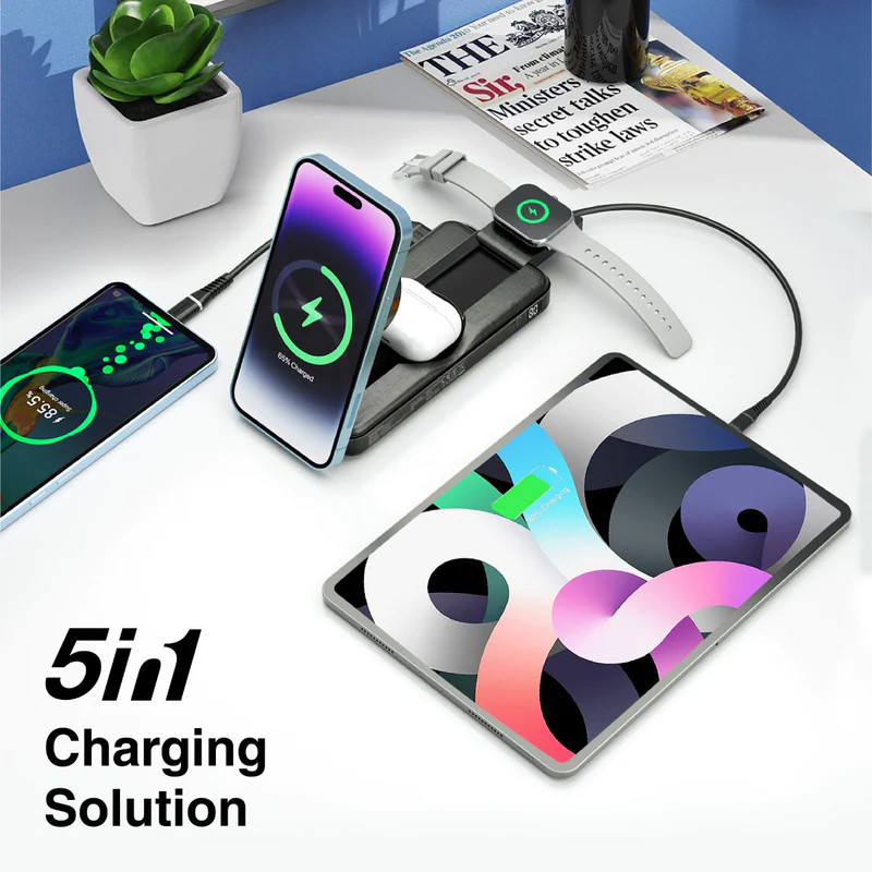5 خروجی شارژ/ دارای ماژولهای شارژ اختصاصی برای آیفون، اپل واچ و ایرپادز، به همراه یک پورت USB-C PD 20 وات و یک پورت USB QC 3.0 18 وات