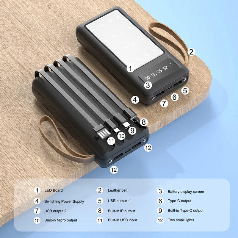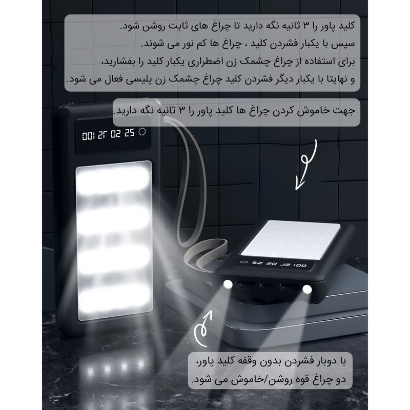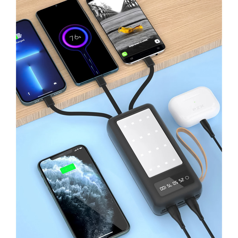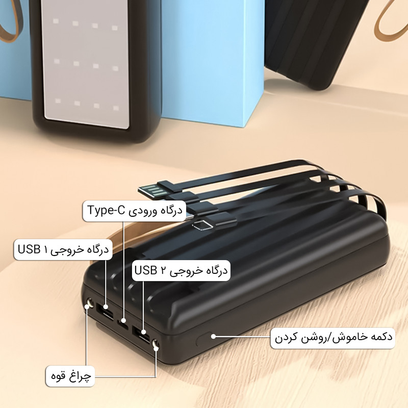 درگاه شارژ Type-c - دارای دو درگاه خروجی USB - کابل خروجی لایتنینگ - کابل خروجی Type-c - کابل خروجی Micro USB - کابل ورودی USB