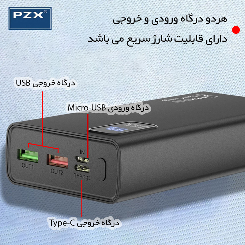 برند معتبر PZX - ظرفیت 20هزار میلی آمپر ساعت - پشتیبانی از شارژ سریع 22.5 وات - تکنولوژی QC 3.0 - شارژ سریع PD - دارای 2 درگاه USB - دارای یک درگاه Type C - دارای یک درگاه میکرو USB