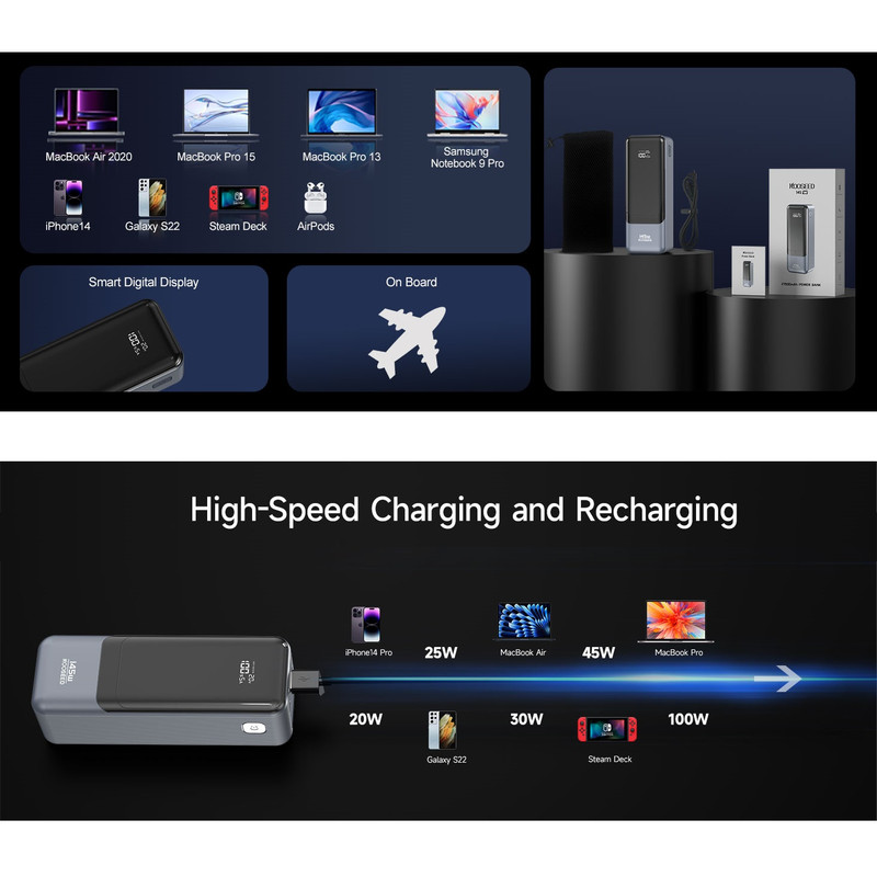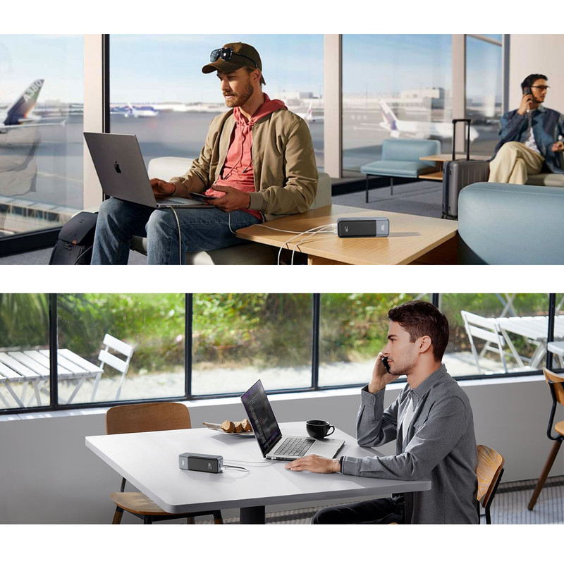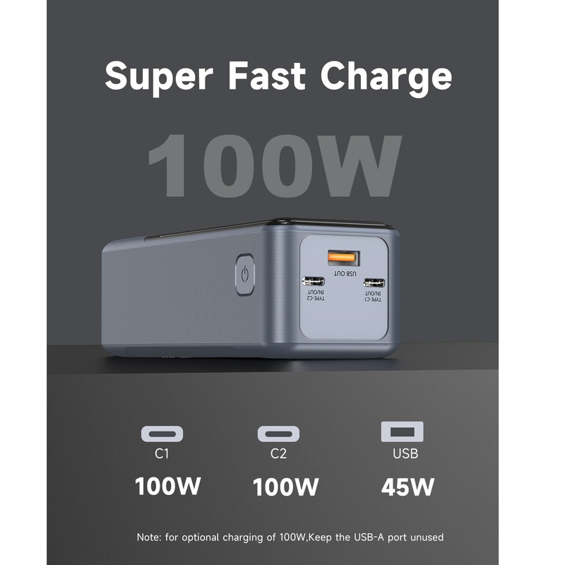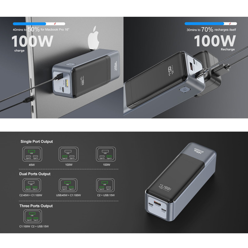 پاوربانک ۱۰۰ واتی USB-C: از طریق نوآوریهای مداوم در فناوری، پاوربانک لپتاپ میتواند قدرت فوقالعاده سریع ۱۰۰ واتی را فراهم کند. این پاوربانک میتواند مکبوک پرو ۱۴ اینچی را در عرض ۳۰ دقیقه از ۰ تا ۵۰ درصد شارژ کند. ۳ پورت خروجی (۲ پورت USB-C + ۱ پورت USB-C A) به علاوه شارژ فوقالعاده سریع میتواند مشکل کمبود برق هر دستگاه را در هر زمانی حل کند و به شما امکان میدهد بدون نگرانی سفر کنید.