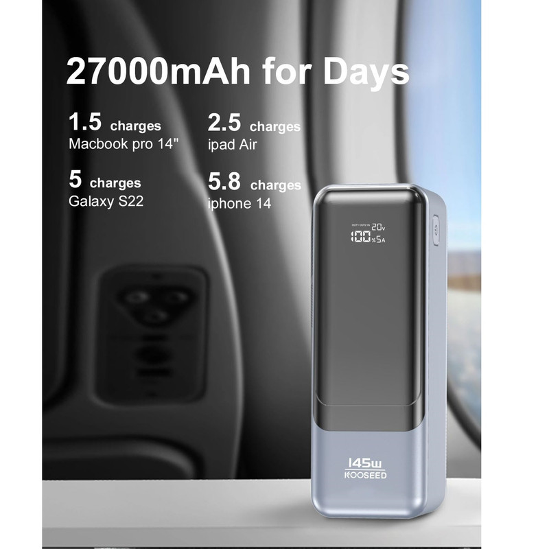 پاوربانک لپتاپ KOOSEED 145W، شارژر قابل حمل 3 پورت 27000 میلیآمپر ساعتی با نمایشگر دیجیتال هوشمند، باتری داخلی و خارجی USB C برای سری آیفون، سامسونگ، دل، ایرپاد و غیره