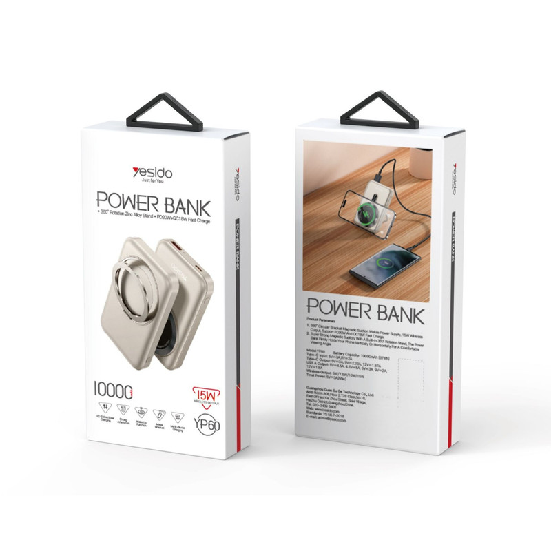 پاوربانک YP60 از برند معتبر Yesido با ظرفیت 10000 میلیآمپر ساعت طراحی شده و قابلیت شارژ سریع و شارژ بیسیم را بهطور همزمان در اختیار کاربران قرار میدهد. این پاوربانک از طریق درگاه Type-C با حداکثر توان ۱۸ وات شارژ میشود (5 ولت 3 آمپر یا 9 ولت 2 آمپر) و زمان شارژ خود دستگاه را کاهش میدهد.
