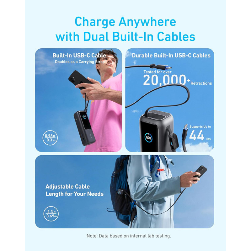 دو کابل USB-C داخلی تعبیهشده (Built-in USB-C cables) — به این معنی که کابلها داخل بدنه هستند و نیازی به حمل جداگانه نیست.