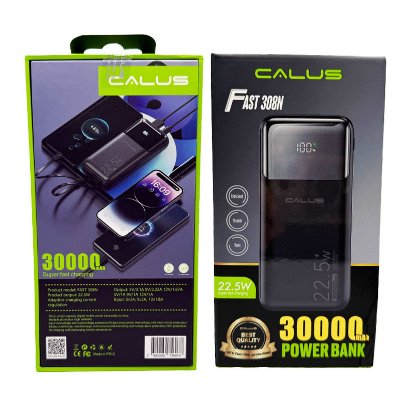 CALUS Power Bank Model 308N برند CALUS مدل 308N ظرفیت 30,000 میلیآمپر شارژ سریع پشتیبانی از فستشارژ 22.5 وات پورتها سه پورت: عادی، فستشارژ، سوپر فستشارژ چراغ قوه ندارد کیفیت ساخت طراحی مقاوم و ارگونومیک قابلیت شارژ همزمان امکان شارژ چند دستگاه به صورت همزمان