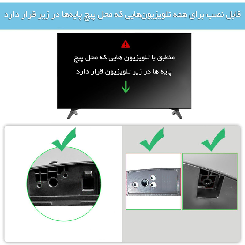 آیا این پایه به تلویزیون من نصب می شود؟ چنانچه محل پیچ پایه تلویزیون شما در طرفین چپ و راست و کف آن قرار دارد، بله این پایه به دستگاه شما متصل خواهد شد.