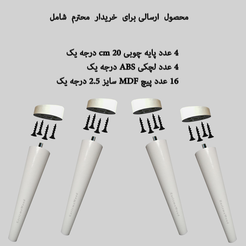 این محصول 4 عدد پایه چوبی مخروطی 20 سانتیمتر رنگ شده و آماده نصب آسان می باشد که همراه با 4 عدد لچکی و 16 عدد پیچ MDF سایز 2.5 در یک بسته بندی برای خریدار محترم ارسال میشود.