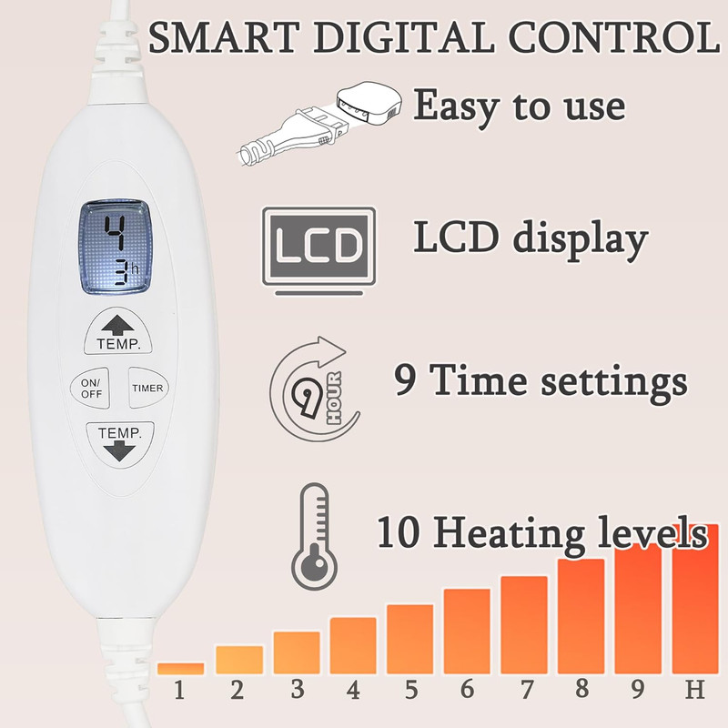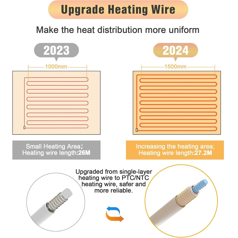 گرما: طول کل سیم گرمایش 27.2 متر است، سیم های گرمایشی متعدد به طور مساوی در پتوی گرمایشی توزیع شده اند و دما به سرعت افزایش می یابد. در مقایسه با پتوهای معمولی، شما می توانید قبل از رفتن به رختخواب به سرعت گرما را احساس کنید و وجود سیم های گرمایشی را در داخل آن احساس نمی کنید و به شما امکان می دهد یک خواب عالی داشته باشید.