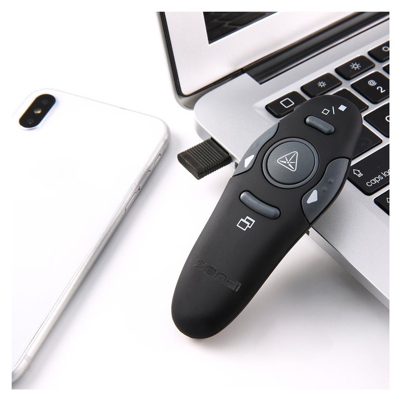 گیرنده بی سیم 2.4G با پورت USB / برد: 15 متر / لیزر قرمز / وزن: 40 گرم / کاربرد: سخنرانی ها، دوره های آموزشی و همایش ها و ... / باتری: 1 عدد باتری نیم قلمی ( خرید باتری به صورت جداگانه )