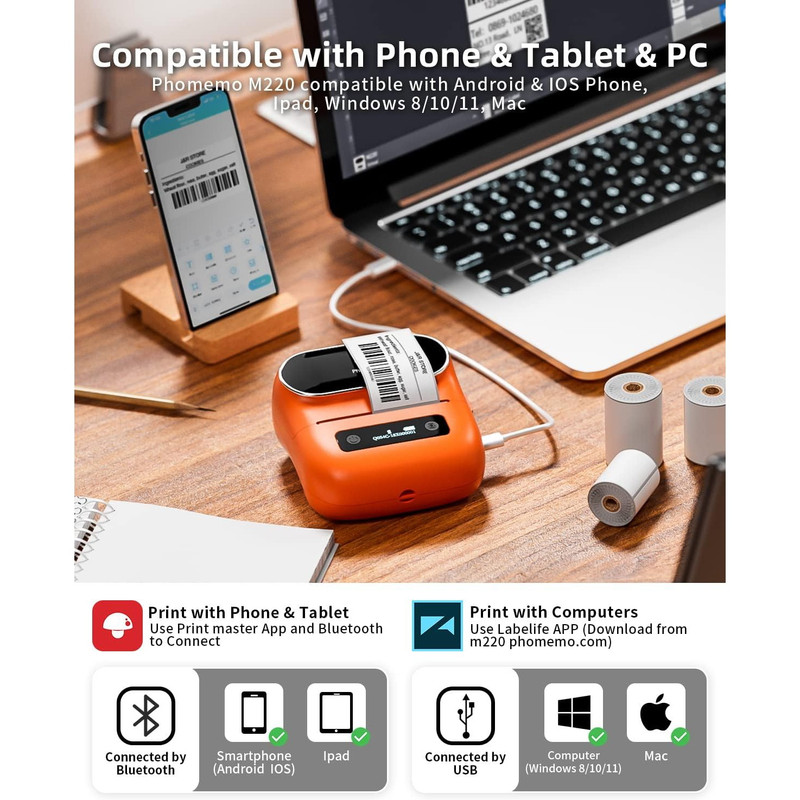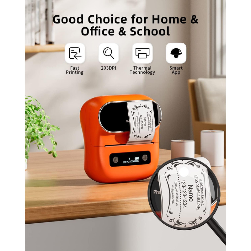 دستگاه به رنگ نارنجی به همراه سه سایز رول لیبل حرارتی به ابعاد 7در8 سانتیمتر ,5در8 سانتیمتر و 5در3 سانتی متر می باشد