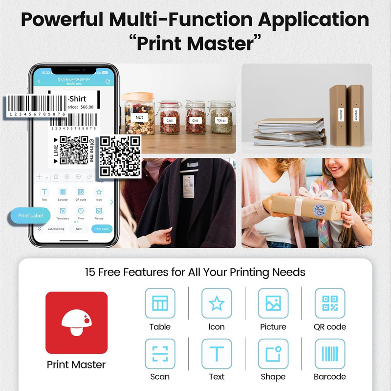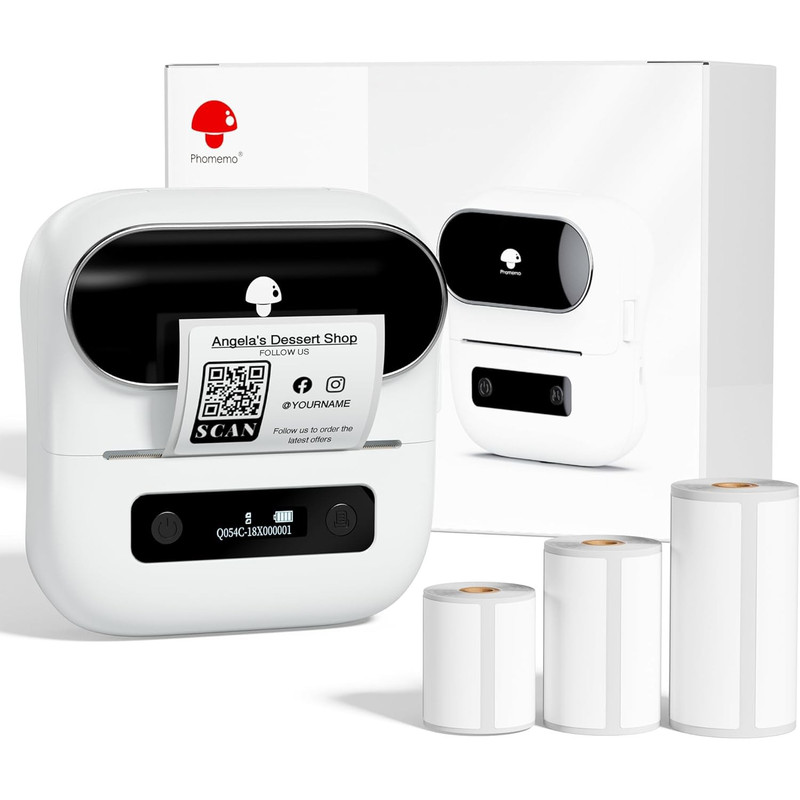این دستگاه به رنگ سفید بوده و همراه آن سه سایز رول لیبل حرارتی فومیمو با ابعاد 8در7 سانتیمتر , 5در8 سانتیمتر و 5 در 3 سانتیمتر قرار دارد.