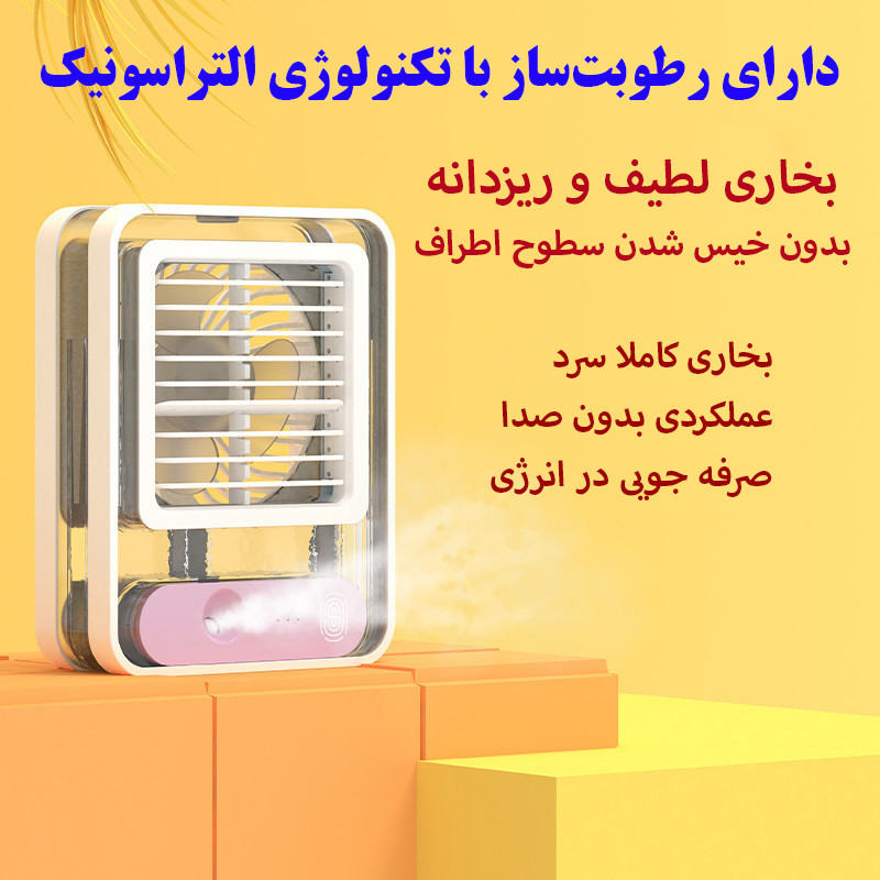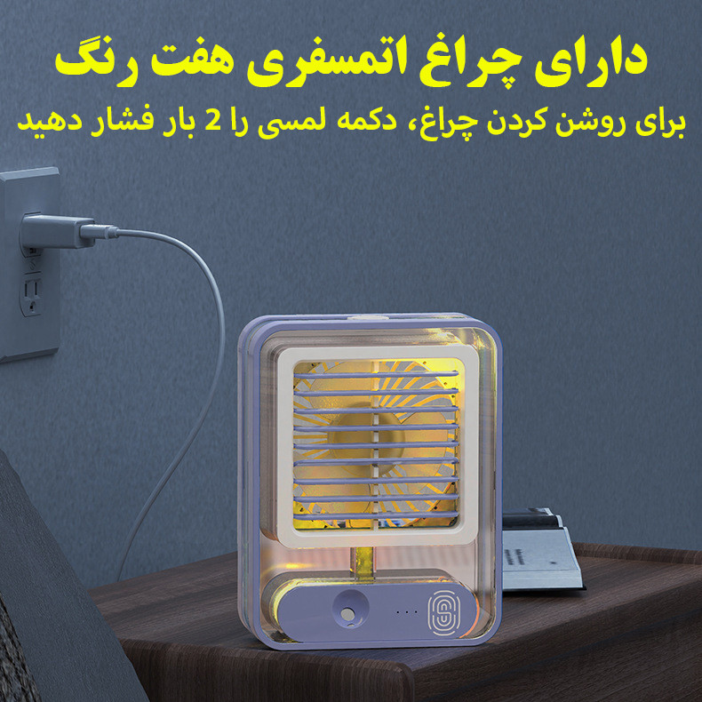 قدرت باد فوقالعاده - قابلیت تنظیم زاویه وزش باد - باتری 2400 میلیآمپر - دارای سه حالت سرعت باد - قابلیت رطوبتساز - مخزن آب 200 میلیلیتری - دکمه لمسی - دارای چراغ اتمسفری 7 رنگ - بسیار کم صدا