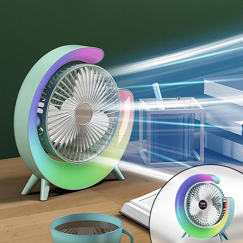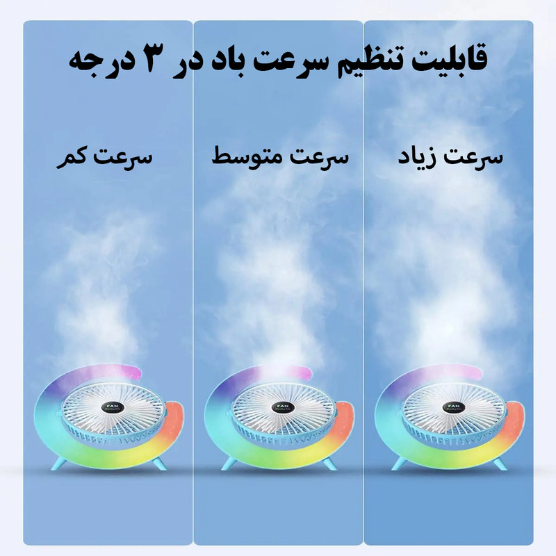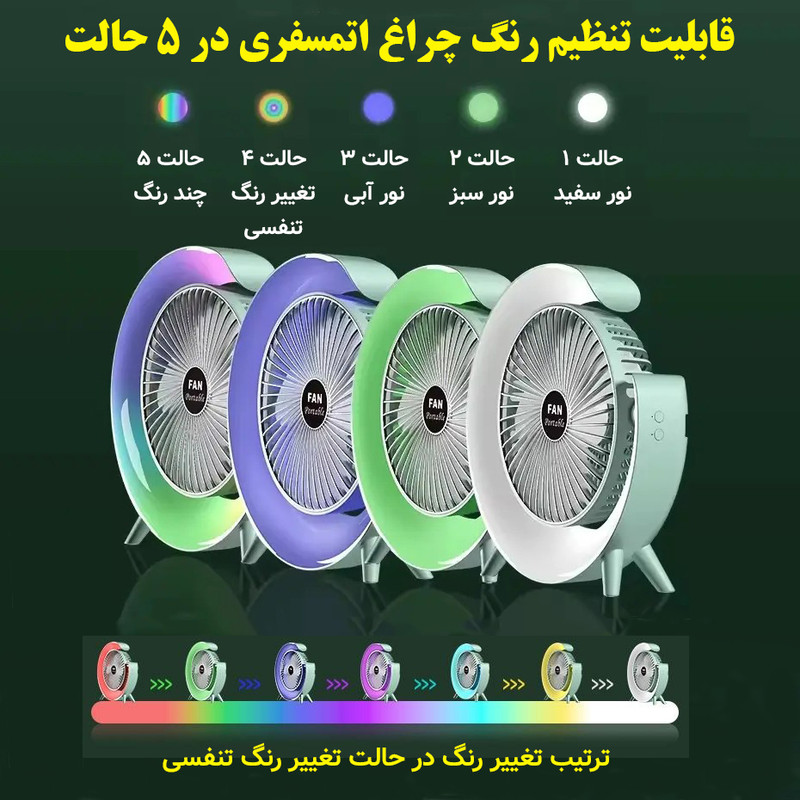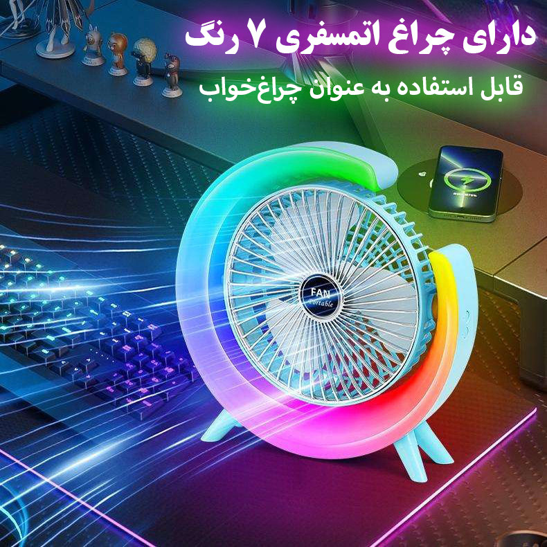 دارای چراغ اتمسفری هفت رنگ با 5 حالت رنگ متفاوت - دارای سه حالت سرعت باد - قابلیت چرخش 180 درجه جهت تنظیم زاویه باد - باتری 18650 با ظرفیت 1800 میلیآمپر - قدرت باد فوقالعاده - قابل استفاده به عنوان شب خواب - دارای دکمه های مجزا برای پنکه و چراغ اتمسفری جهت استفاده هر کدام به صورت مجزا - درگاه شارژ Type-C با قابلیت شارژ سریع