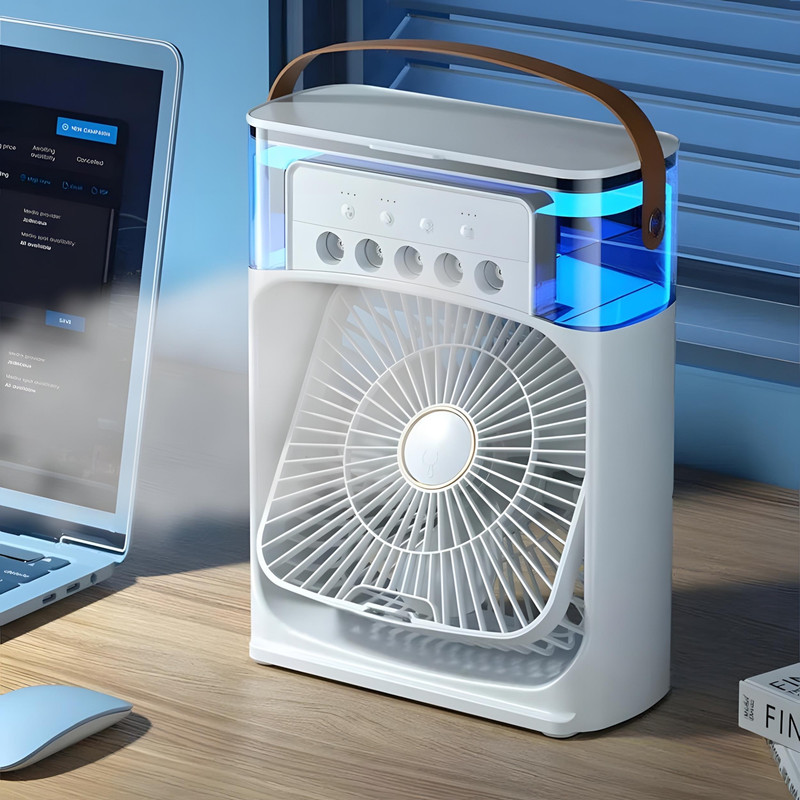 امکانات دستگاه شامل مه پاش با 5 نازل فعال، فن قوی سه سرعته با چرخش 1800rpm، چراغ ال ای دی 7 رنگ و تایمر 1، 2 و 3 ساعته می باشد. دستگاه جمع شونده بوده و حمل آن بسیار ساده است. مصرف برق بسیار بهینه و قابل اتصال به تمام درگاه های USB با خروجی 5V2.0A می باشد. صدای دستگاه در حد 30 دسی بل بوده، ورودی 2 آمپر و توان گردش پره 1800rpm، ابعاد کلی 21x10x28 میلی متر و ابعاد فن، حدود 15x15 میلی متر می باشد.