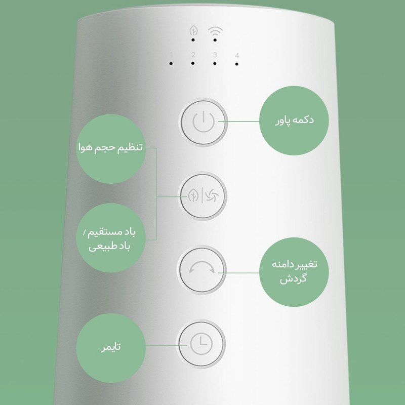 بر روی دکمه بدنه فقط میتوانیم 1 تا 4 درجه را تنظیم کنیم، در حالی که در برنامه میتوانیم از 30 درجه تا 140 درجه را تنظیم کنیم و از طریق برنامه نوسانات چپ و راست پنکه را کنترل کنیم و این در حالی است که دکمههای روی بدنه تنها میتواند کنترل کند که پنکه به سمت چپ و یا راست بپرخد.